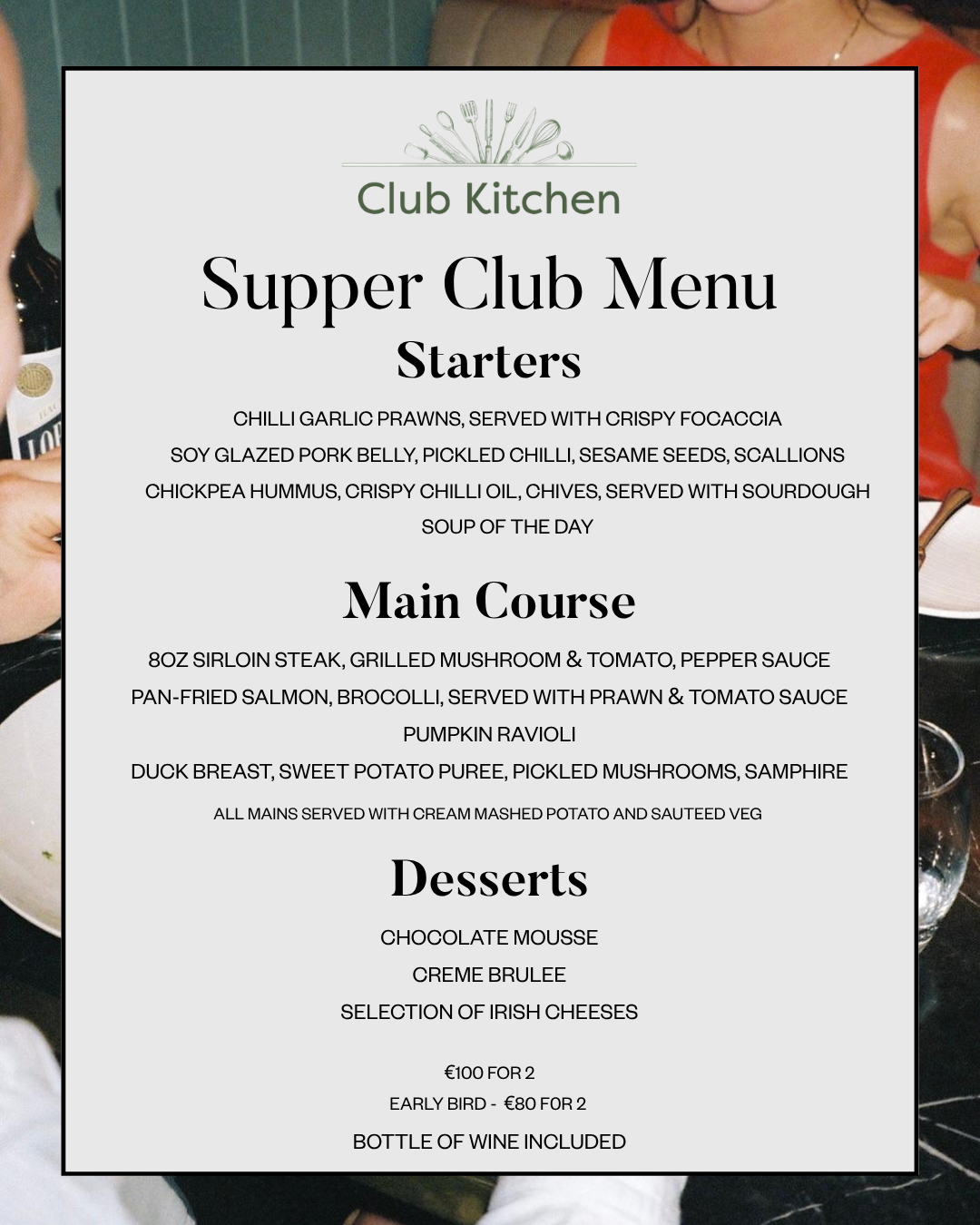 - Supper Club: Three courses and a bottle of wine for €100 per couple